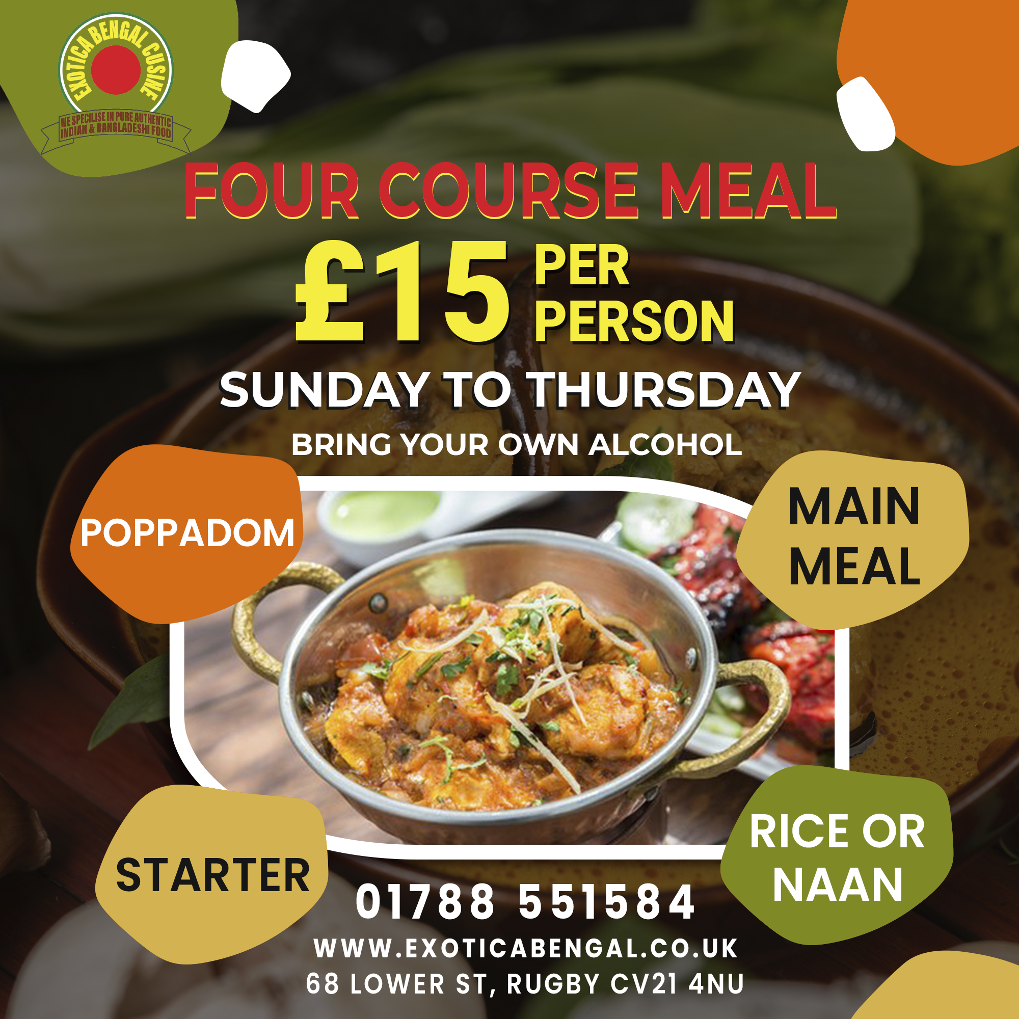 The Exotica Bengal Cuisine opened in Rugby in 2002! It rapidly established as the most complete restaurant in Rugby. It set the standards of cooking and service so consequently, many customers have shared their enjoyable experience with friends and family